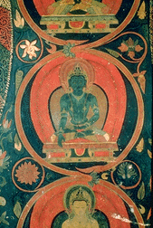 The Tibetan Buddhist pantheon is far too complicated to go into here, but essentially Tibetans conceive of three levels or tiers of transcendent beings. There is the type of buddha, such as Sakyamuni, who was born and appears as a human being. There's a mid-level of dhyani buddhas, a concept of a buddha on a higher plane. And then there's a third, higher level, a concept of a primal buddha, who's beyond reach. At the mid-level, the dhyani buddhas are often conceived of as four directional buddhas: a buddha of the north, south, east, and west. They're depicted in different ways; each can be identified by, for example, its color, the positions of its hands and which attributes it is holding. It's very conventionalized: the buddha of the south holds a wish-fulfilling jewel, the buddha of the north holds a different object. And then in the center, there's a presiding buddha